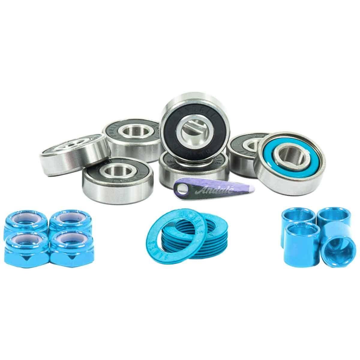 Set of 8 bearings, 4 spacers and 4 axle nuts, 8 replacement shields including tool
