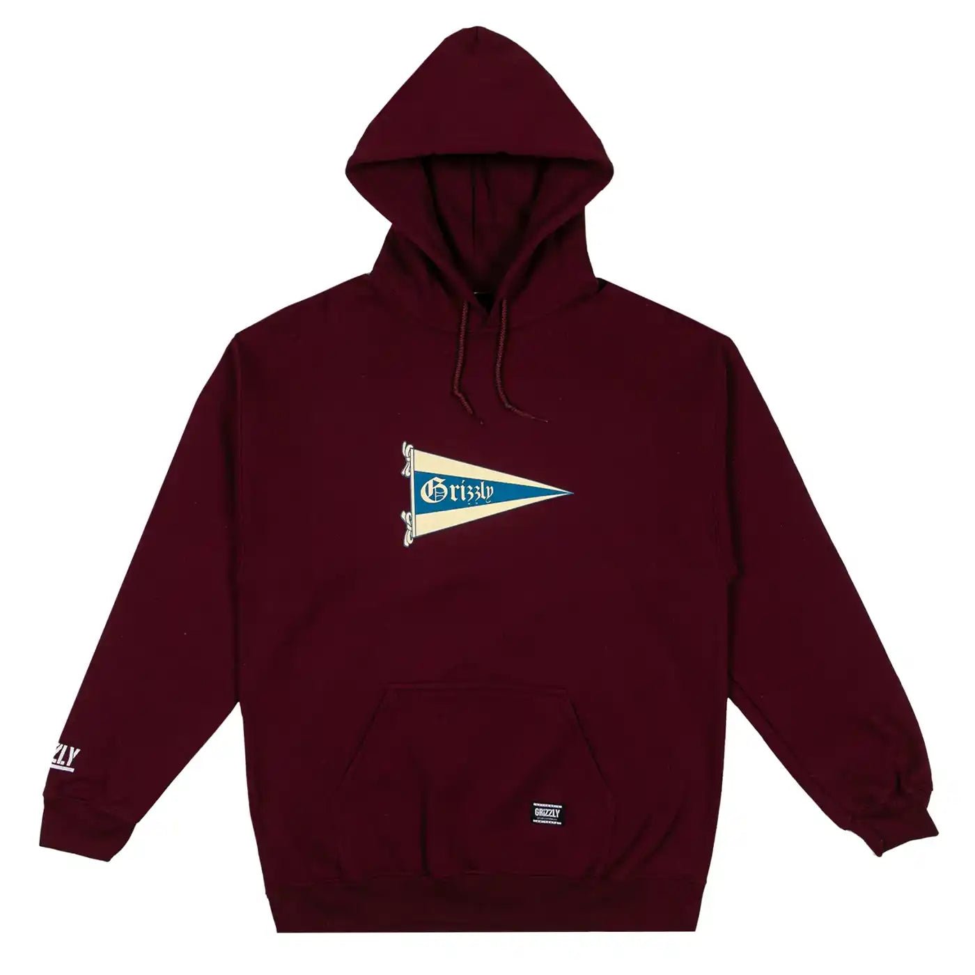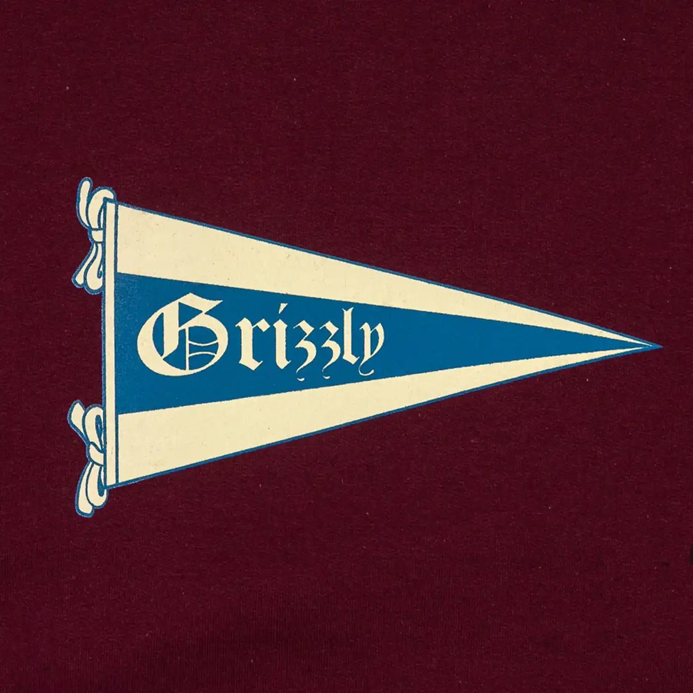 Woven grizzly label at bottom left